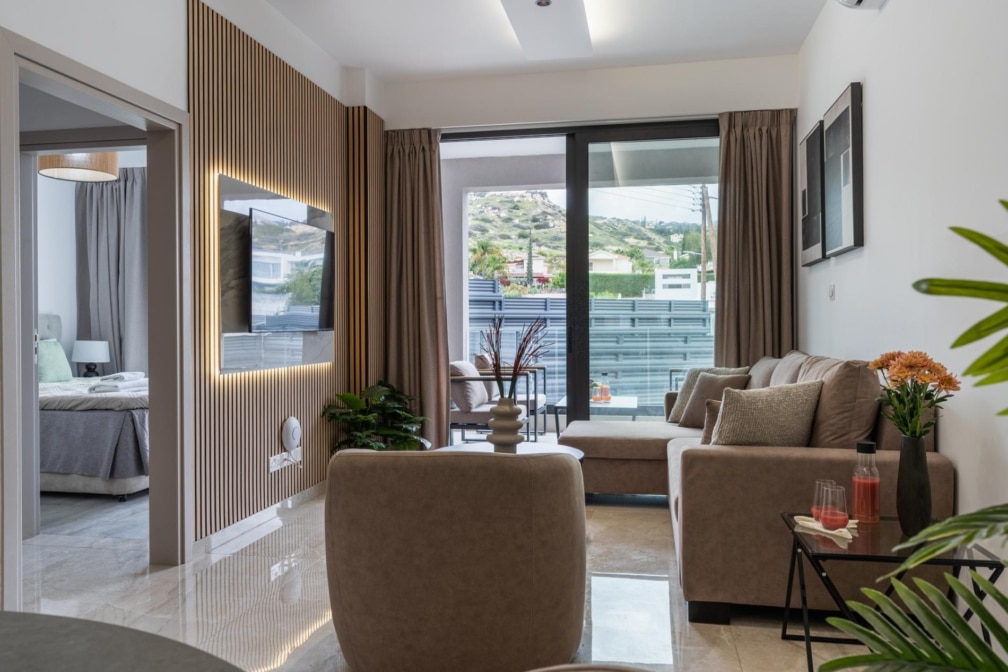 Amato Riverside by Ezoria Villas – Apt 101 is a cozy two-bedroom apartment located on the first floor of this intimate 14-residence building in Ayios Tychonas , a space where simplicity meets calm, and every detail has been considered for comfort.