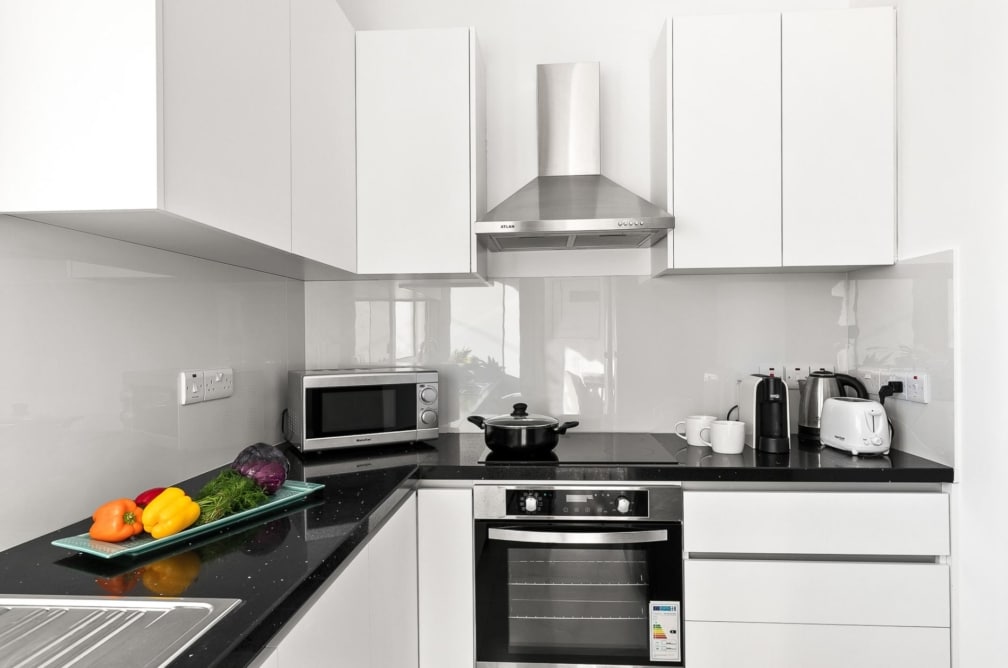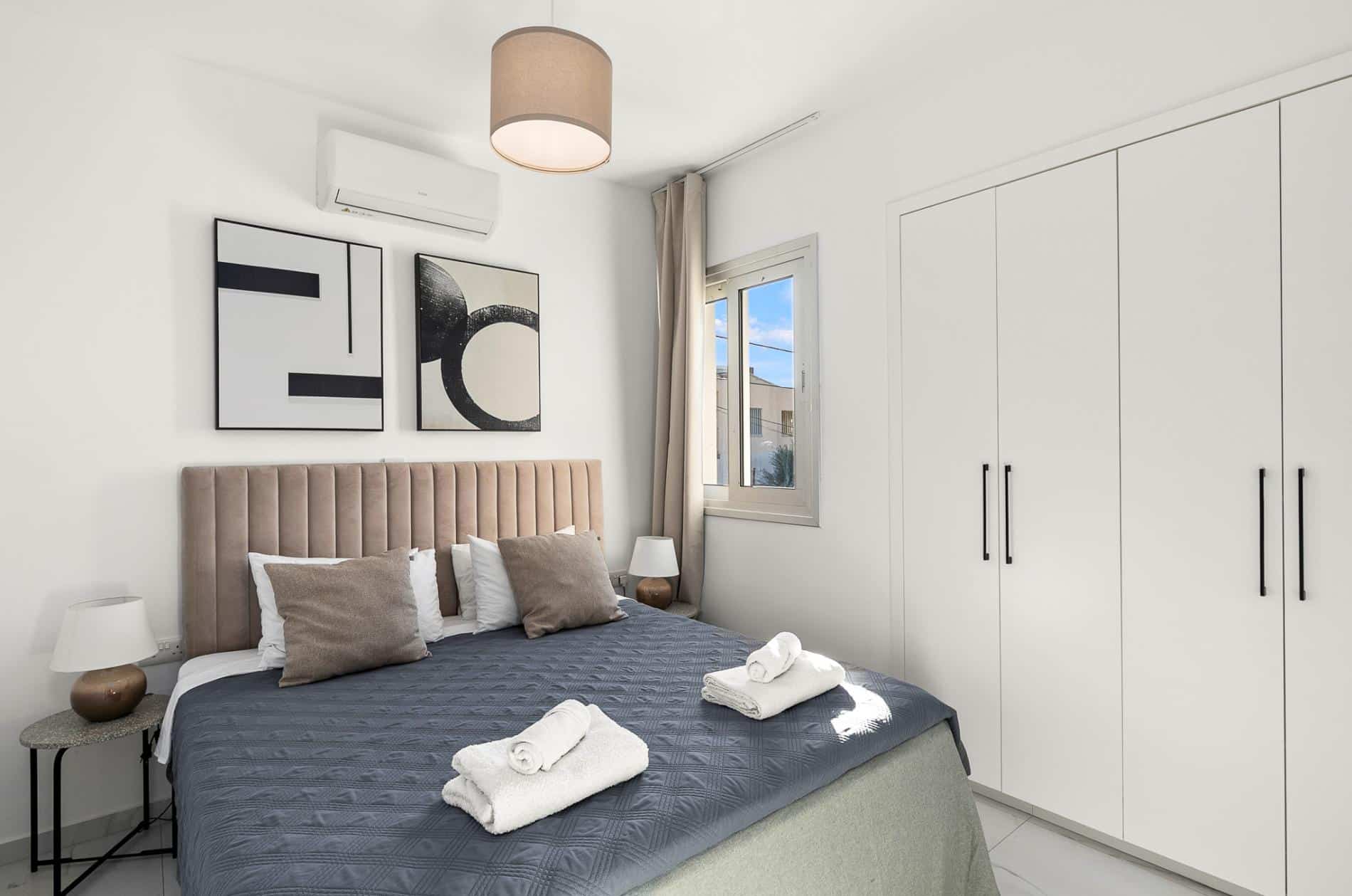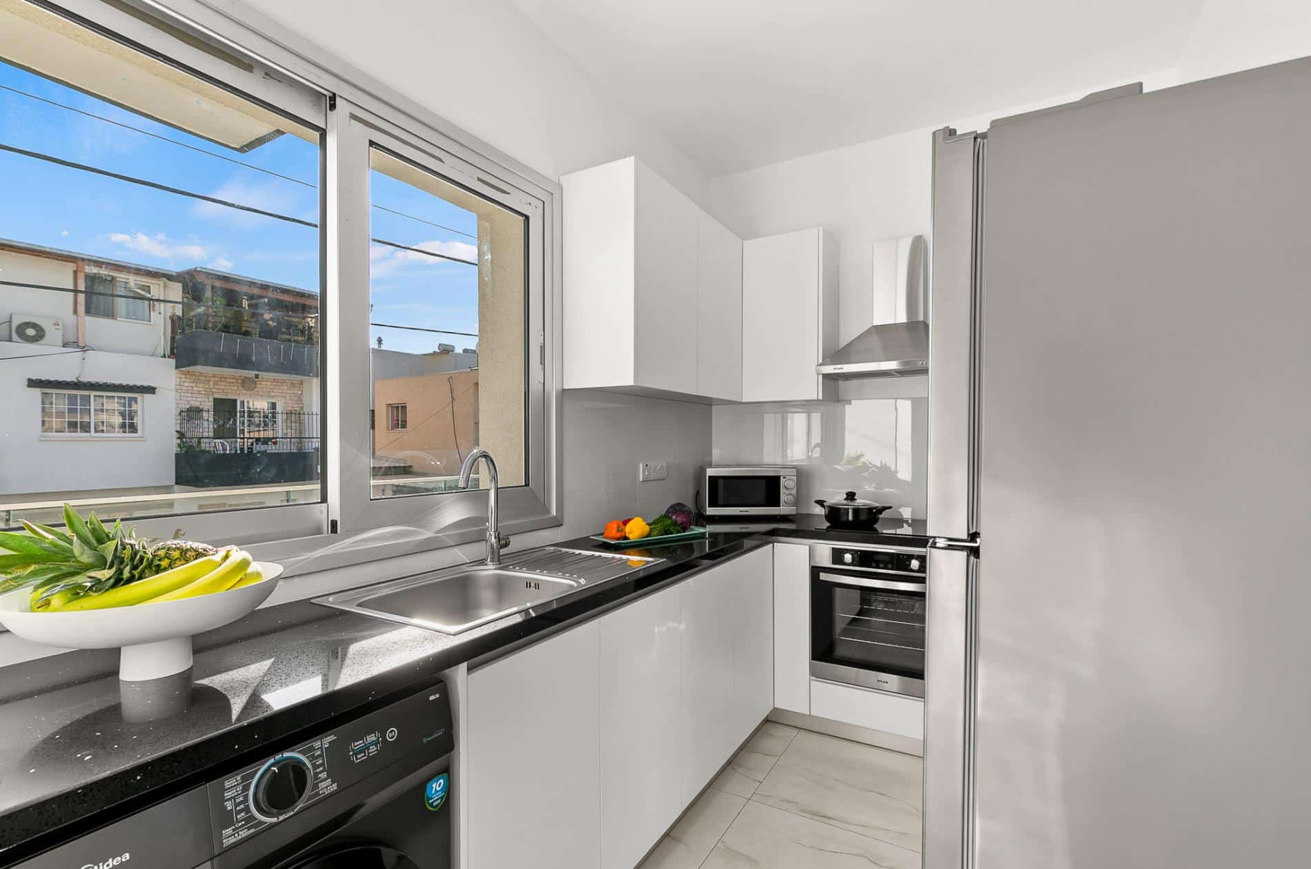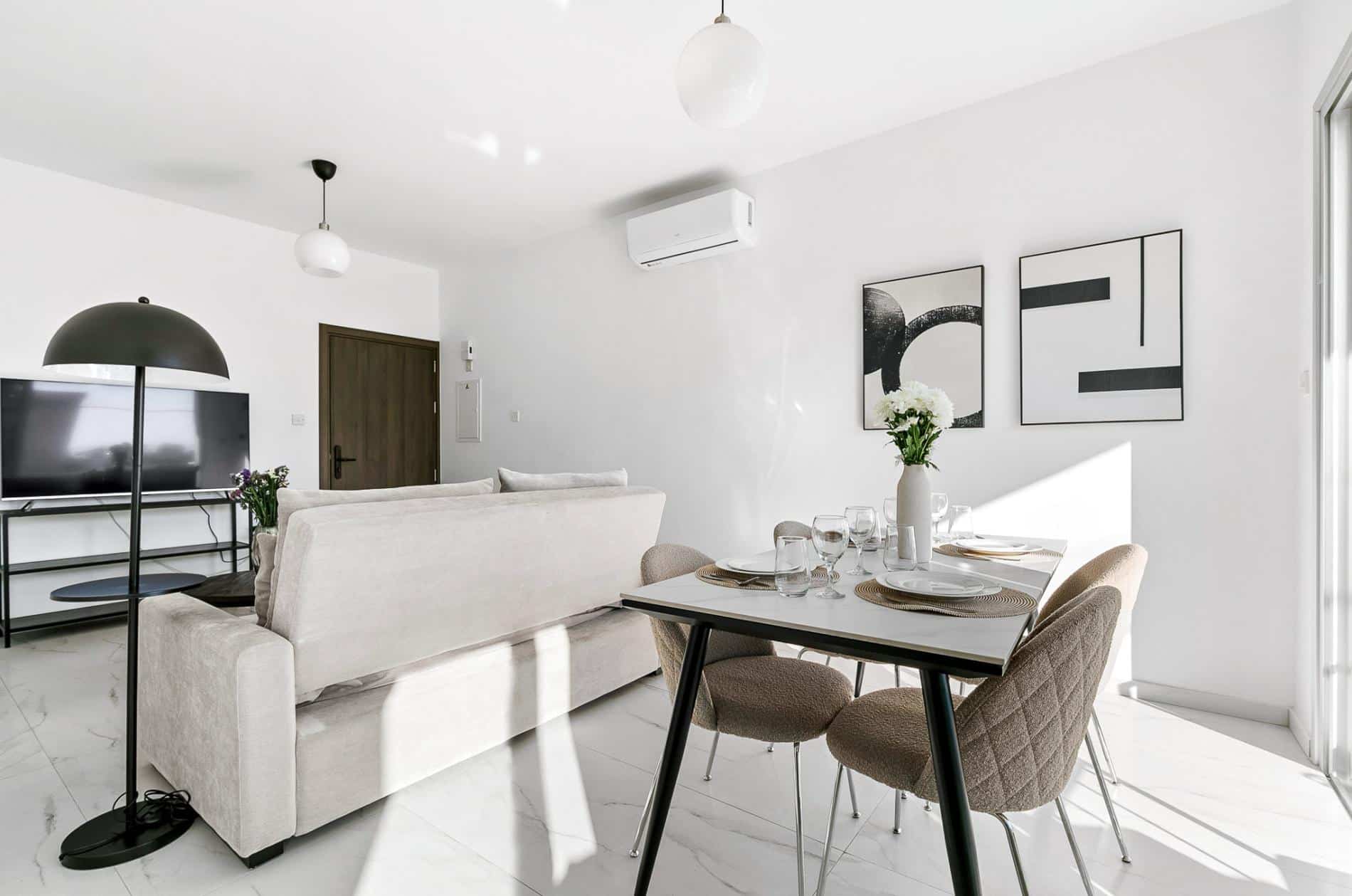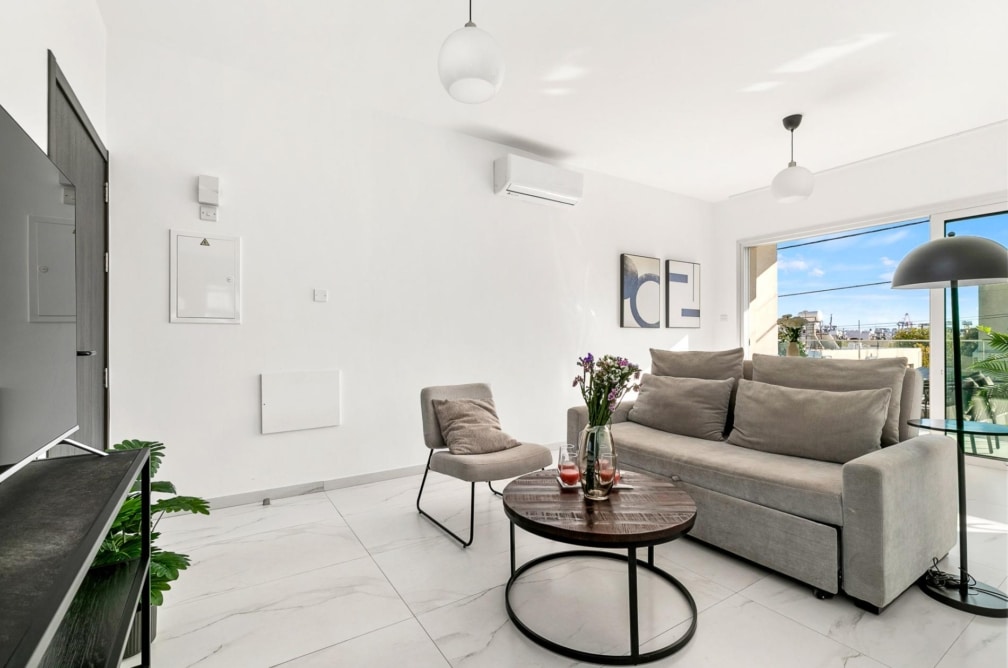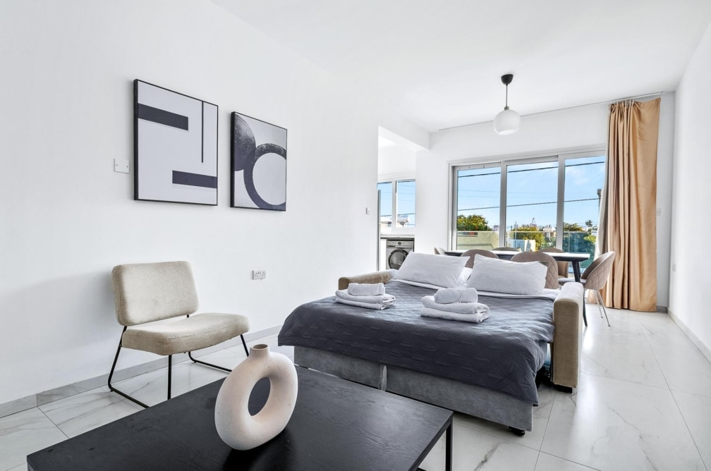 Step inside to a space designed for ease. Clean lines, contemporary furnishings, and natural light create an atmosphere that feels calm and considered. The apartment features one comfortable bedroom, a modern bathroom with a walk-in shower, and a double sofa bed in the living area, simple details that make everyday living feel effortless.