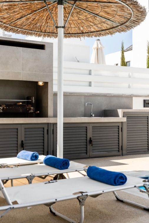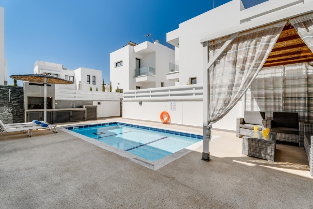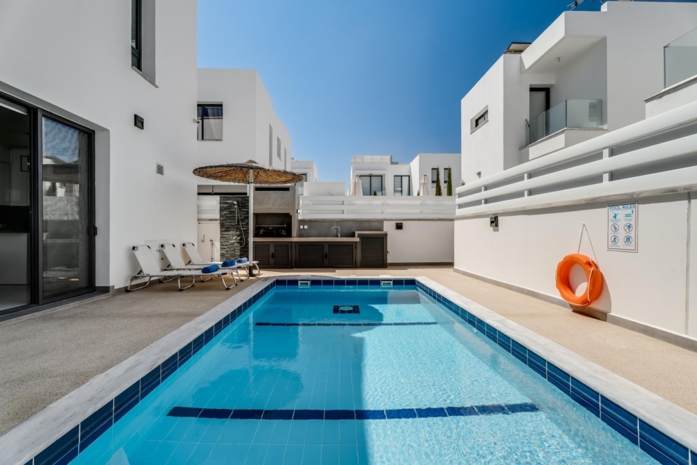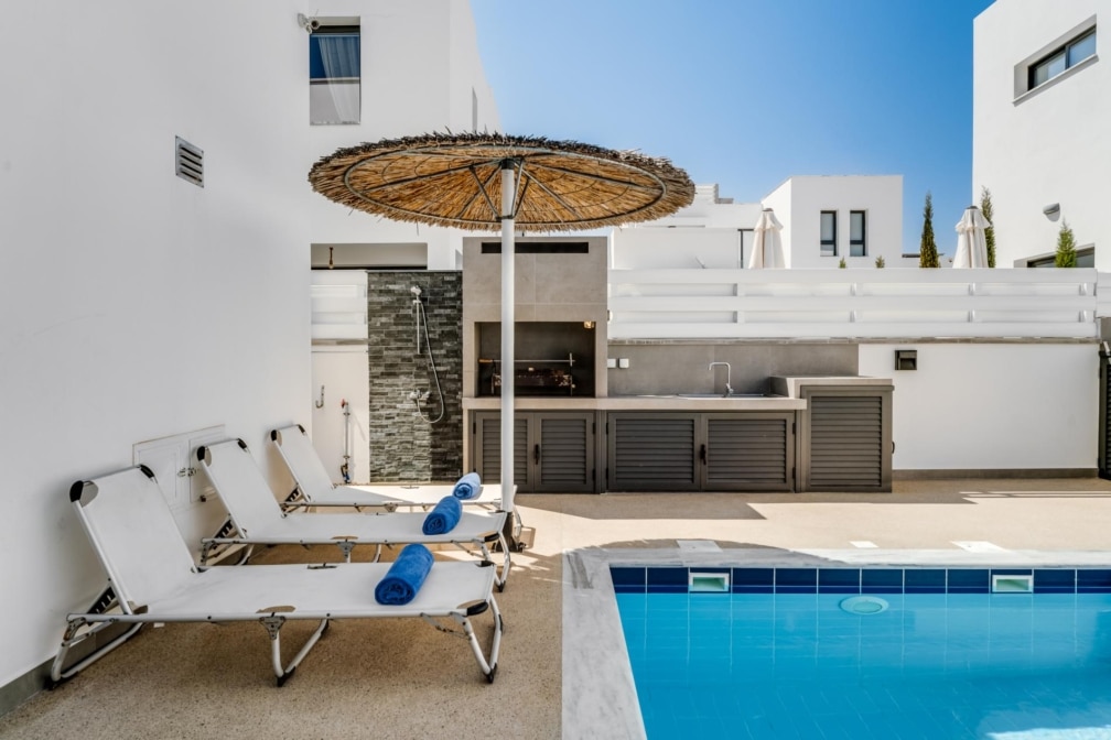 Outside, a private pool (6.5m x 3m, Depth 1.45-0.80) glimmers under the Cypriot sun, framed by loungers, shaded seating, and a traditional charcoal BBQ for long, unhurried meals. From morning swims to sunset gatherings, the villa invites a rhythm that feels both effortless and restorative.