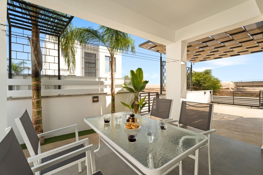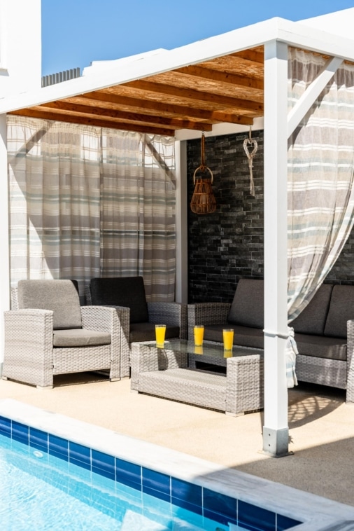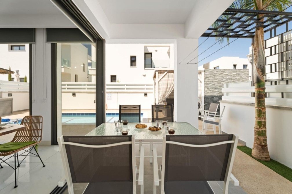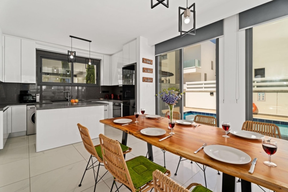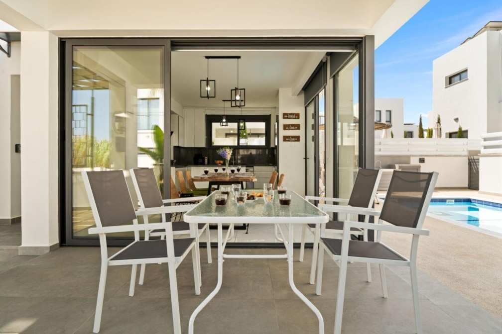 Alassia 16 by Ezoria Villas is a modern three-bedroom retreat where ease meets coastal charm. Designed with space and light in mind, the villa opens into an airy living, dining, and kitchen area that flows seamlessly outdoors, to a private pool, sun drenched terrace, and garden made for slow afternoons and open-air dinners.